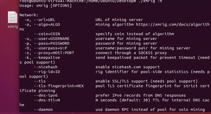 接着,把 xmrig 木马拿到本地虚拟机进行分析,发现该木马是门罗币挖矿木马,它可以指定 url 进行挖矿、后台运行挖矿程序、以及指定钱包地址等方式进行挖矿活动 。