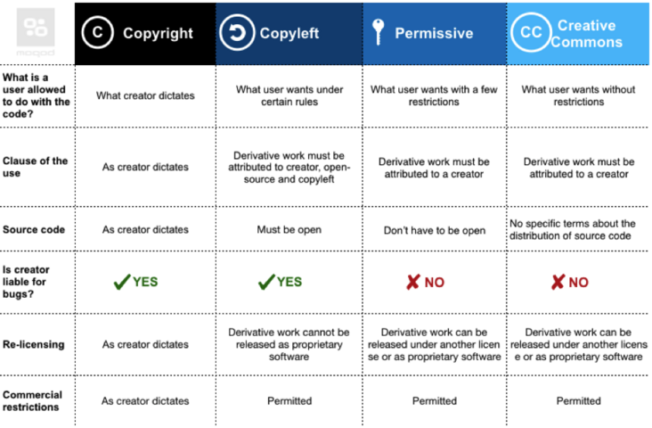 下面,我们通过一张表来简单了解一下常见开源许可证之间的区别: