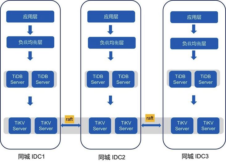 这是 TiDB 在微众银行的部署架构,如图所示,首先 TiKV 选择三副本,分别部署在同城的三个数据中心,这样可以实现 IDC 级别的高可用,同时在每个 IDC 部署了一套 TiDB Server,通过绑定到负载均衡器提供 VIP 服务,这样使得应用可以做到多活接入的模式。这套架构也经受过 IDC 级别的真实故障的演练验证,将其中一个 IDC 的网络全部断掉,观察到集群可以快速恢复,我们认为TiDB 能够符合金融场景高可用的要求。