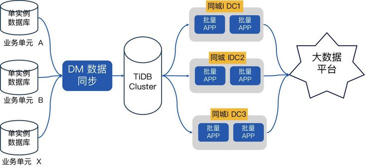 升级改造后的架构如下图所示,可以看到微众银行把各个业务单元的数据通过 DM 工具把数据实时同步和汇总到 TiDB,然后批量 APP 直接基于 TiDB 做批量计算,再把结果传到大数据平台,相当于借助了 TiDB 的水平扩展性来达到批量效率的水平扩展。之前是传统的 MySQL 主备架构,会要求 APP 服务器 要跟 MySQL 的主节点是部署在同一个 IDC,而如果是跨机房访问,网络延时会比较大进而影响批量耗时,所以其他 IDC 的 APP服务器 就处于 standby 的状态,会有一定的资源浪费,而 TiDB 架构的所有 TiKV 节点可以同时读写,所以可以多个 IDC 同时启动批量任务,最大化资源利用率。