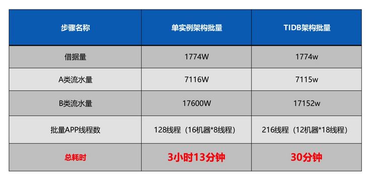 1.批量效率的提高。下图左边是微众银行其中一个贷款业务的账单日的批量耗时对比,可以看到在单实例架构下面,批量大概是跑三个多小时,而微众银行通过借助 TiDB 进行架构的升级优化后,耗时减少到了 30 分钟左右,有绝对效率上的提升。