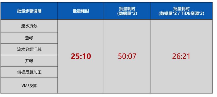 2.线性水平扩展。微众银行的需求不仅仅是效率提升,而且要求其做到水平扩展,也就是弹性伸缩。因为随着业务发展,借据量包括用户量在持续增长,如果存在热点或者其他瓶颈,以后想继续提升将十分困难,下图右边是展示其批量耗时的对比情况,在初始的一个资源情况下大概跑 25 分钟,如果数据量翻倍,耗时增加到 50 分钟,如果想把这个耗时降下来再把资源也翻倍,可以发现耗时又降回到 26 分钟左右,可见已经具备线性扩展能力。所以除了效率上的提升,线性扩展能力的一大好处就是随着业务持续的发展,借据数、借据量都在快速增长,这套架构将无需担心业务快速增长可能出现的技术瓶颈,业务可以更加聚焦于产品本身,这是 TiDB 带来的一个实实在在的业务价值。
