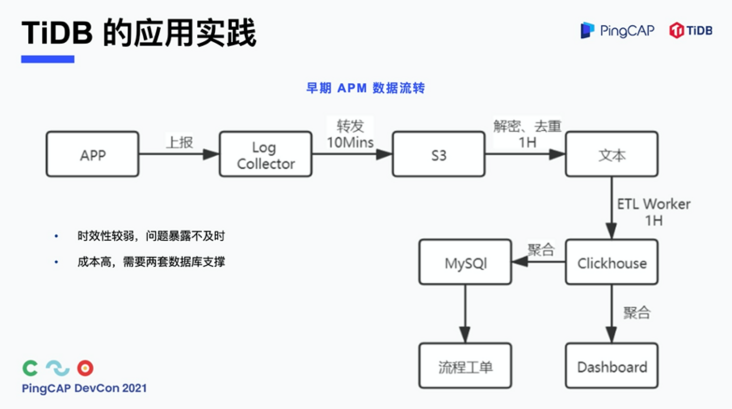 首先分析一下早期 APM 的数据流转,从 APP 数据上报到日志收集,最后到 ClickHouse,整个数据流转是一个类似批处理的流程,大概需要两个多小时,整体时效性偏弱,问题暴露不及时,会对用户体验产生影响。另外,这套系统里面有 MySQL 和 ClickHouse 两套数据库。为什么这么设计?因为 ClickHouse 可以用来做数据的分析聚合,MySQL 主要是用来打造流程工单,同时有两套数据库在支撑,在成本上比较高。