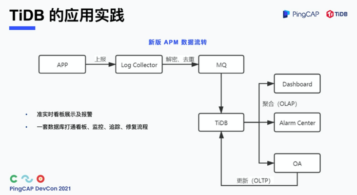 再来看引入了 TiDB 之后的新版 APM 数据流转,可以看到从 APP 的上报,到看板展示,到报警,再到流程工单,实现分钟级的准实时看版展示和报警。这部分主要是借助了 TiDB 的 HTAP 能力,通过聚合分析向看版进行展示,向报警中心进行及时的报警。同时,利用 TiDB 的 OLTP 能力进行看板的行更新。所以,我们可以通过一套 TiDB 数据库打通看版、监控、问题的追踪和修复流程。