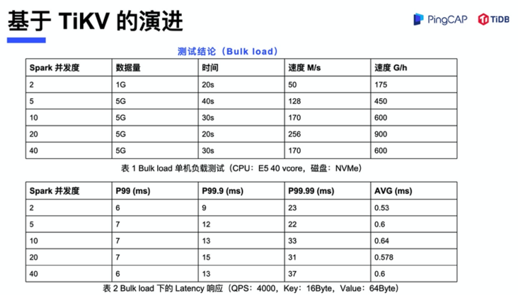 以下两张表是基于 TiKV 的 Bulk Load 能力进行实际测试的结果。上面这张表是在 E5 CPU,40 个 vcore,磁盘使用 NVMe 的情况下,最大可以达到 256 兆的单机吞吐。下边这张表是我们在进行 Bulk Load 的同时对 online reading 部分进行压测,可以看到 Latency 响应时间的抖动是非常小的,不管是 P99 还是 P99.99 ,都是处在一个比较稳定的状态。这个测试结果是一个 Demo 的验证,相信后续经过我们的优化,不管是存储吞吐还是响应延迟,都会有质的提升。