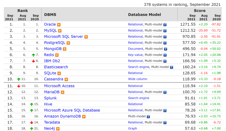 DB-Engines 数据库引擎 9 月榜单出炉:Oracle、MySQL、Microsoft SQL Server 蝉联前三甲