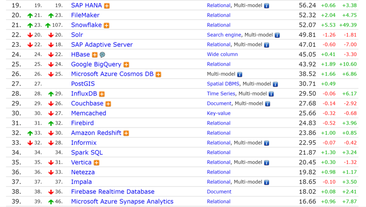 从趋势图中,排名前 15 位的数据库项已经用彩色标记了出来。在这里,我们可以很直观的看到每项数据库近年来的流行趋势。比如,本次DB-Engines 榜单中,尽管 Oracle、MySQL、Microsoft SQL Server 一直稳居前 3 名。但就发展趋势而言,排名第 3 的 Microsoft SQL Server 曲线其实是往下走的,而排在第 4、5 名的PostgreSQL、MongoDB 则一直呈上升趋势。