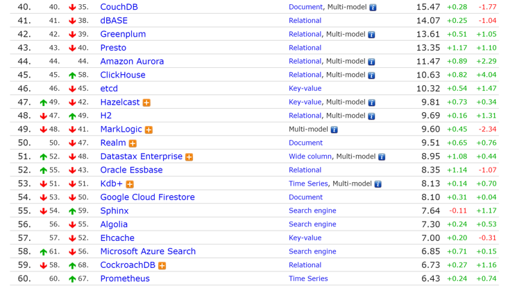 本次榜单前 10 里,除去前 5 的位置无变化之外,后面 5 位里面有小变动。其中,去年排在第 7 位的 Redis ,今年以171.94 的得分排到了第 6 位;去年排第 6 的 IBM Db2 ,今年以166.56 的得分降了一名排到了第 7 ,两者排名出现了互换。