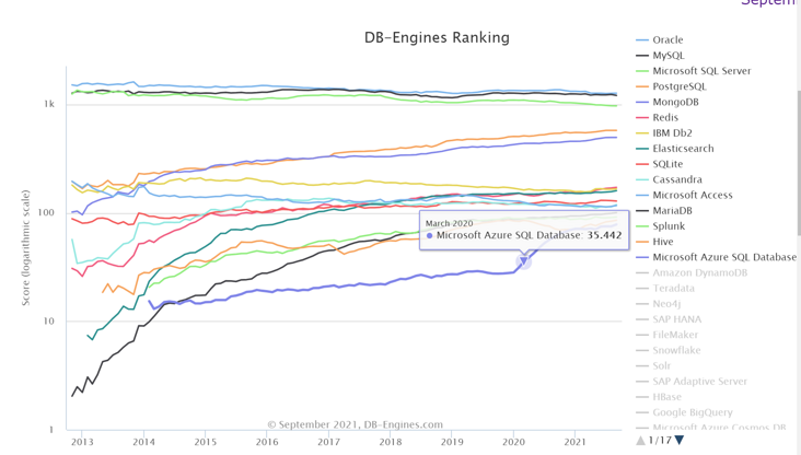 除了排行榜,我们还可以看到榜单中所有数据库2013年-2021年间的排名趋势图。