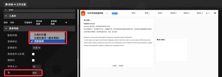 2. 在【工作台 > 全局配置 > 前端 > 主页设置 > 菜单导航】中,设置菜单样式为顶部级联,并根据菜单节点数设置合理的宽度。