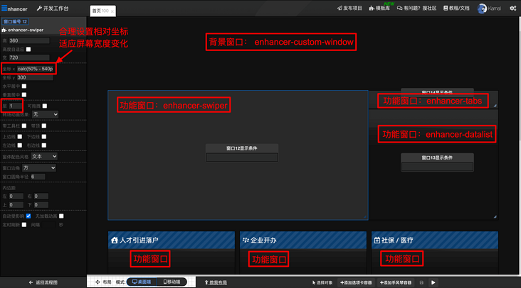 3. 在【工作台 > 页面管理】中创建首页页面,添加窗口并做相应的布局设置。