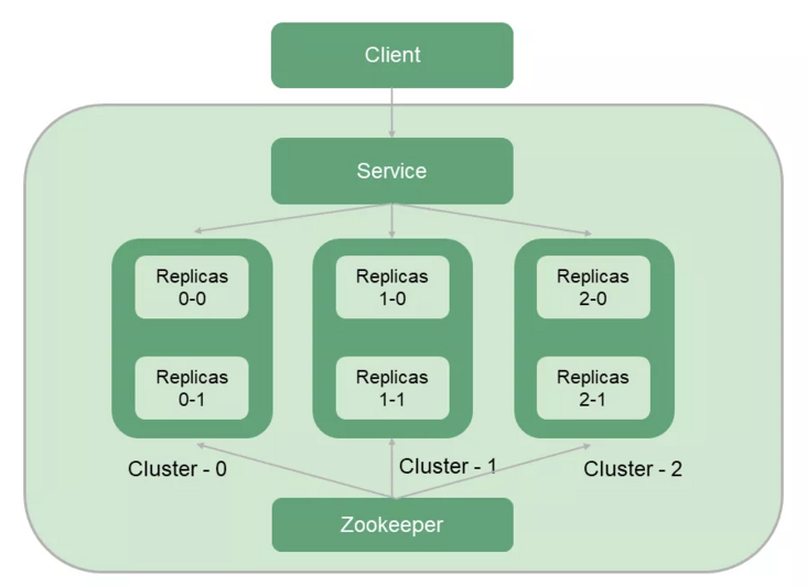 可获取六个正在运行的 RadonDB ClickHouse Pod,以及三个 Zookeeper Pod,组成三分片两副本的集群,同时提供一个 ClusterIP service,供访问使用。如果需要在外部对集群进行访问,此处可通过