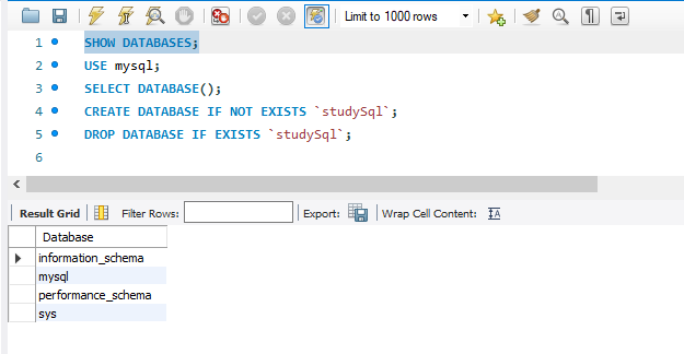 // 1、展示所有的数据库,即使没有创建任何一个数据库,系统默认也会有四个数据库 SHOW DATABASES; // 2、选择数据库 mysql USE mysql; // 3、显示当前所选择的数据库 SELECT DATABASE(); // 4、如果不存在数据库 studySql 则创建 CREATE DATABASE IF NOT EXISTS `studySql`; // 5、如果存在数据库 studySql 则删除 DROP DATABASE IF EXISTS `studySql`;