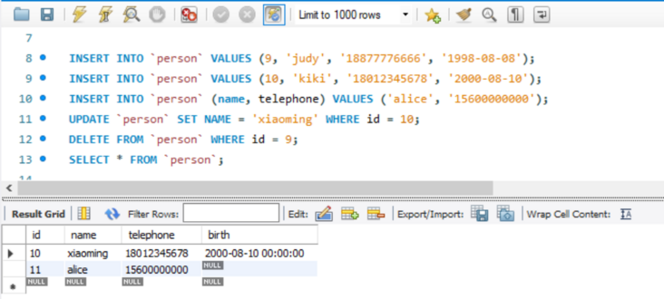 INSERT INTO `person` VALUES (10, 'kiki', '18012345678', '2000-08-10');