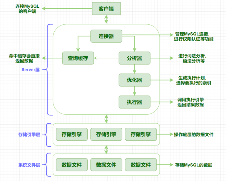 在上图中,我们简单的画了下MySQL的逻辑架构图,并且给出了逻辑分层和每层中各部分的功能。从逻辑上,我们可以将MySQL粗略地分成三层:Server层、存储引擎层和系统文件层,而Server层中又可以分成网络连接层(连接器)和数据服务层(Server层)。