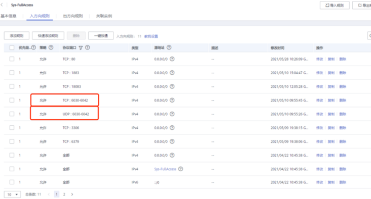 对于云服务器出现的外网连接问题,我们的第一反应其实就是安全组的端口策略配置。所以,我们先让用户登陆了集群节点所在的华为云后台,并发来安全组配置的截图。在确认了安全组策略没问题之后,我们才开始了其他操作。