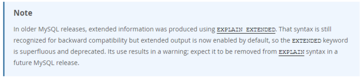 注意:explain 后面跟的关键字 EXTENDED(扩展信息) 在MySQL5.7及之后的版本中废弃了,但是该语法仍被识别为向后兼容,所以在5.7版本及后续版本中,可以不用在 explain 后面添加 EXTENDED 了;