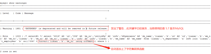 使用这个工具可以将执行的SQL语句的一些扩展信息展示出来,这些扩展信息就包括:MySQL优化时可能会添加上字符集转换函数,使得字符集不匹配的SQL可以正确执行下去;