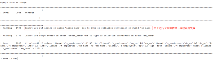 上面的SQL中 em_name 为索引字段,字段类型是 varchar,为其赋 int 类型的值时,会发现索引失效,这里也可以通过 explain extended + show warnings 查看,会发现如下图所示内容: