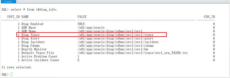 那么在哪里可以找到跟踪文件呢?通过查询数据字典v$diag_info可以确定跟踪文件的存储路径,如下所示。