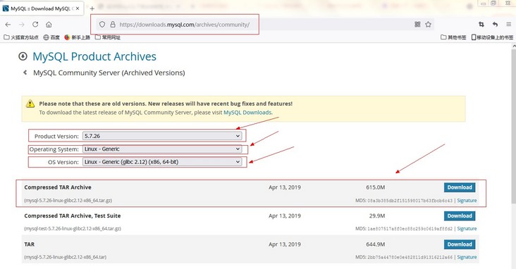⑤进入mysql版本归档页面后选择你所需要的mysql版本、操作系统及系统版本,然后点击download即可下载