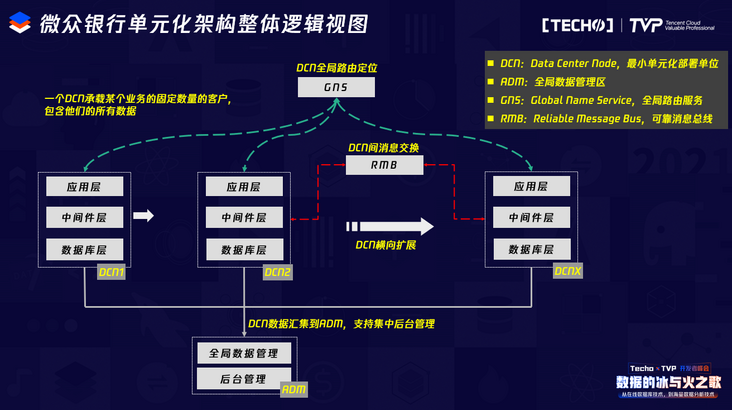当然DCN并不能承载所有的业务场景,有些归档场景 ,可能是要从DCN汇总过来统一存储和计算,还有一些数据是全局数据,无法进行DCN拆分,所以我们看到下面会有一个全局数据管理和后台管理的区域,叫ADM区。用来解决这一类业务场景。
