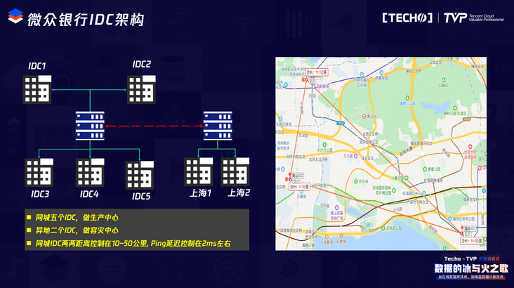 微众银行现在IDC的建设,是2地7中心的IDC架构,我们在深圳有5个生产机房作为生产中心,在上海有2个容灾机房作为容灾中心。我们在深圳同城的这5个机房选址也是有规定的,两两IDC的距离控制在10-50公里的范围内,以此来保证IDC之间的网络延迟在2毫秒左右,这是数据库多副本跨同城IDC部署的前提。
