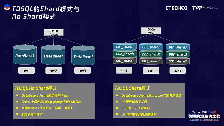 再补充一下TDSQL的两种使用模式,一种是NO Shard模式,也就是TDSQL的单实例模式。这种架构下,TDSQL proxy单纯做一个SQL转换的功能,到底层的SET以后,每个STE就是一个独立的单实例架构,SET之间的库是没有关系的,这种No Shard架构没有在中间件层做分库分表,所以逻辑会简单很多。但这种模式的SET需要扩容的话,就只能在SET内部去做垂直扩容。这种架构的优势在于它不涉及分布式事务,也不涉及数据库的分片,所以它的语法是完全兼容的,且架构简洁。