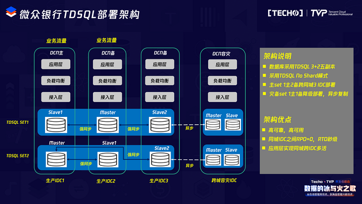 基于以上背景知识,我们来看看微众银行的TDSQL的部署架构。从竖向的维度来看,每个框里就代表一个IDC,左边有三个生产IDC,右边还有跨城容灾——上海的两个IDC。从底层来看,最下面是我们的数据库,采用TDSQL数据库,一主两备的架构,三个副本分布在同城的三个IDC内部,比如Master在南山机房,Slave1可能在观澜机房,Slave2可能在福田机房。Master、Slave之间采用TDSQL强同步的机制进行数据同步,在一个DCN内我们可能会有多个SET去承载这个数据库。