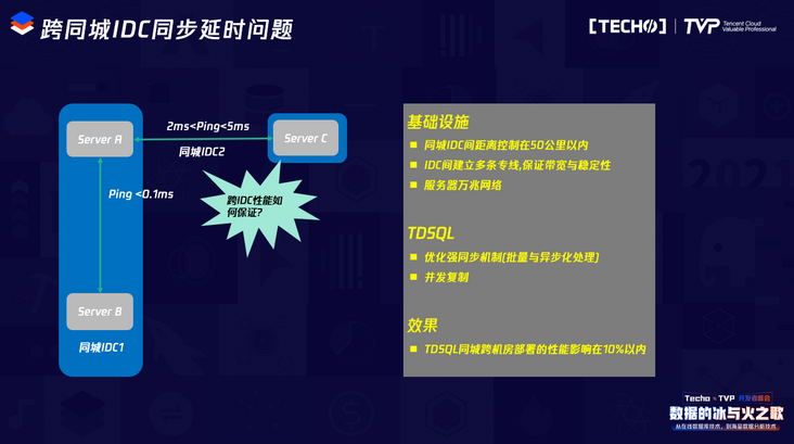 大家可能会有一个疑问:同城的一主两备是分布在三个机房之间的,机房和机房之间可能会有延迟,我们是控制在两毫秒内,但对性能会不会有什么影响?首先我们在基础设施方面,在机房建设上会设定一些原则,刚才也提到同城IDC的距离控制在50公里之内,IDC之间会建立多条专线,保证带宽和稳定性。我们现在全部都是万兆网络的基础设施,这是硬件层面的保证。另外软件层面是针对TDSQL,TDSQL本身对于这种主备之间的强同步机制做了一些异步化和批量化的性能优化,来保证跨机房强同步的性能损失尽量控制在10%以内。