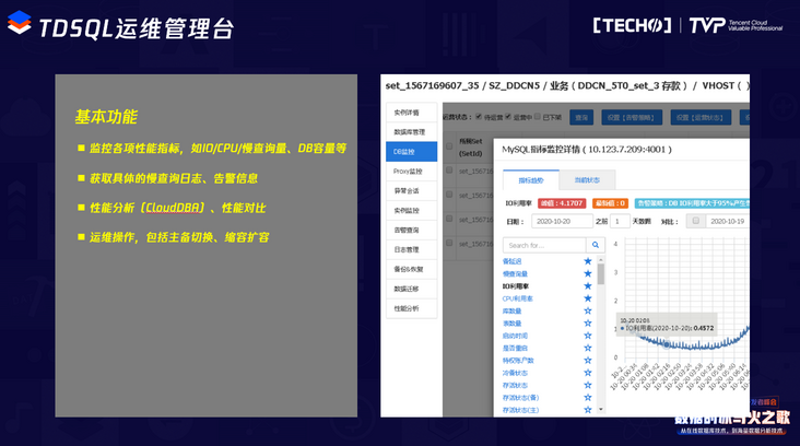 TDSQL配套的运维管理平台也叫赤兔平台,负责实现TDSQL的监控以及运维功能。可以监控所有的TDSQL实例的多项指标,包括各种指标、慢查询、IO、CPU等;大部分的运维操作也集成在平台上,比如主备切换、迁移、扩容、节点替换,可以实现较高度的自动化运维功能。