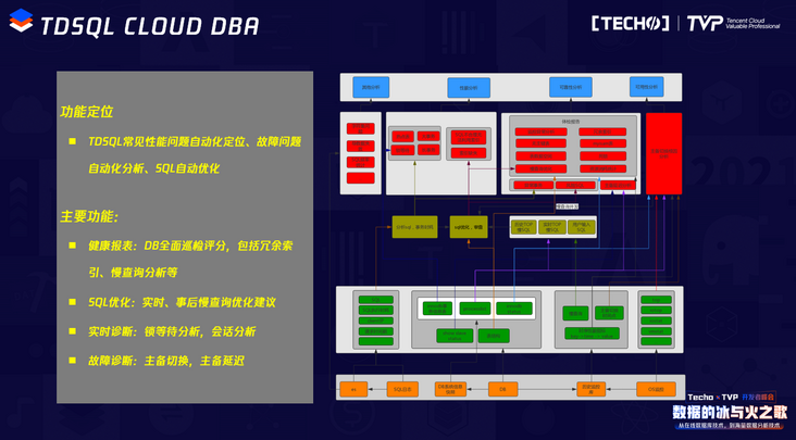 另一个TDSQL比较重要的运维组件叫CLOUD DBA。它是一个智能化的故障定位模块,可以取代DBA的一部分工作,比如分析SQL性能、给出索引建议,故障原因自动分析定位等。CLOUD DBA会主动从TDSQL的实例上采集各种耗能指标、慢查询SQL以及执行计划,最终生成健康报告,以及优化建议。