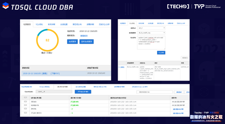 CLOUD DBA的界面,左上的图是打分的功能,它每天可以定时给某一个实例做全面检查,最终打分生成健康报告,为你指出实例可能有哪些缺陷和风险。比如对某一个SQL的检查和优化,可以分析出可能缺失哪些索引,提出增加的优化建议。