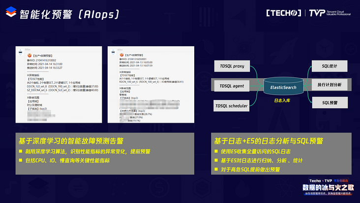 第二个我们正在做的是一个基于数据库日志和ES的日志分析系统。我们会把整个TDSQL所有的日志,包括中间件、监控、调度的日志,全部入库到ES库里,再做一些SQL的耗时统计、SQ执行计划的分析,基于这些分析把一些可能它现在还没有产生,但可能产生风险、威胁的SQL提前挖掘出来,让业务去优化。