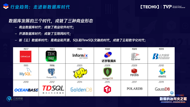 第二个时代是以MySQL为代表的开源数据库时代,开源成就了互联网,今天大家使用了很多腾讯的服务、产品,为什么能够得到快速的、廉价的甚至是免费的互联网服务?就是因为互联网的底座是由免费和开源的精神承载,开源技术成就了互联网。