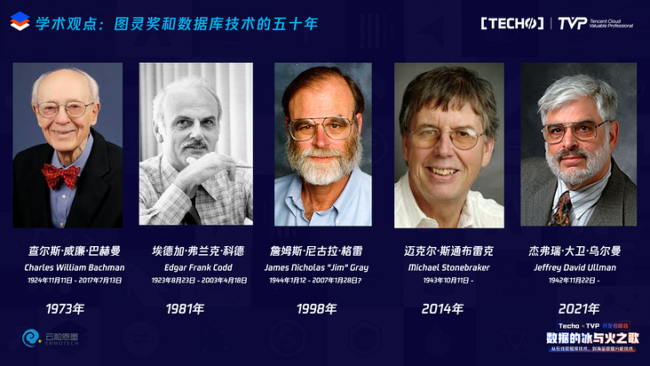 近五十年间图灵奖所授予的5个数据库领域的大神,第一个是巴赫曼,他是网状数据库的发起者。第二个是科德,他是我们今天所在探讨的关系型数据库的缔造者,通过他1970年发表的一篇论文,催生了整个关系型数据库波澜壮阔的大格局,他在1981年获得了图灵奖。第三位是格雷,他是事务理论的深入探究者,他在工业实现上是包括微软等数据库产品的灵魂人物。第四位是迈克尔·斯通布雷克教授,他在2014年获得了图灵奖,也发起了很多数据库项目的创业公司。和大家重点分享一下在2021年刚刚获得了图灵奖的乌尔曼,他的主要成就是在教学领域,他写过非常著名的龙书,是很多数据科学家的启蒙导师。