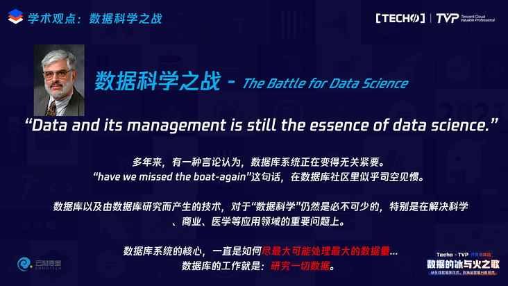 乌尔曼教授在他最近的论文里提出了这样一个观点,叫“数据科学之战”。所以大家已经看到了我提到了两个战争,一场是说数据库是云上的终极之战,这是大家公认的;第二场是数据科学之战。在很长一段时间内数据库领域有一种悲观的声音,大家说数据库管理系统正在变得无关紧要,做数据库的人经常在谈的一句话是“我们是不是又错过了一艘船”,这艘船是数据科学。数据科学的蓬勃发展、火热的现状让做数据库的人觉得是不是我们又错过了一班最好的邮轮。但是乌尔曼教授提出,数据库以及因为数据库研究所产生的技术仍然是数据科学最本质的内核,这个没有变,数据库系统的核心一直是如何尽最大的可能去处理最大的数据量,并且应该去研究一切数据。我认为他把数据库的本质又重新阐述出来了,我们研究数据库的人、研究数据技术的人想做的是什么呢?就是存储一切数据,研究一切数据,最后在这些数据里产生洞察。如果人工智能能够在数据科学里发挥真正的创新作用,那这个世界可以变得更美好,但是它的底座一定是一些原生的数据。