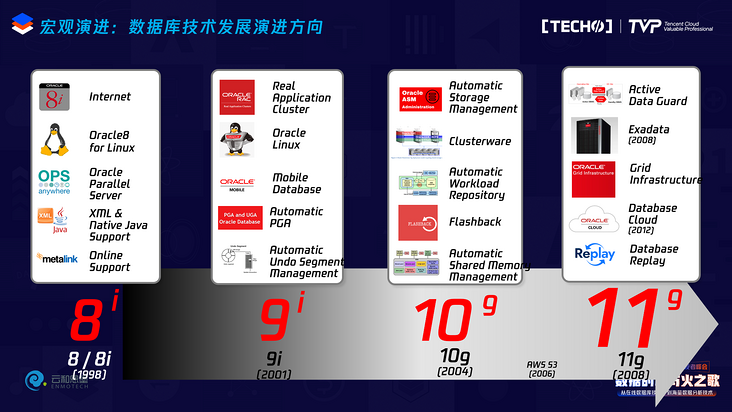 我稍微列举了一下从Oracle8到今天走过的关键历程。在Oracle8这个版本上,大家看到Oracle已经推出了互联网版本8i,Oracle看互联网看得晚吗?不是,它从1998年开始就把产品定义为i,为互联网而生,1998年是什么时候?很多90后那时可能还在幼儿园,但那时的互联网已经在探讨数据库了。Oracle针对并行处理做研发、数据库原生的XML支持,这正好是我入行的时候,所以我最早就研究了这个技术在数据库里的实现。到了Oracle9i做了什么?它做了集群,并且集群真正走向成熟了,就是共享存储的分布式集群,Oracle开发自己的Linux发行版,开始做数据库的自动化技术。到了2004年Oracle10g的时候,做了Oracle自动化存储管理技术,这是一个非常成功的产品,它直接导致了市场上做存储软件的一些公司消失了,所以你可以想象它的影响力,这是非常重要的技术事件。