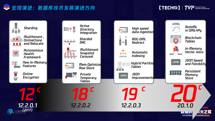 我们快速向下推进,Oracle在2017年推出的12c版本里开始做分布式,并不是像大家理解的Oracle没有分布式。在2018年的时候18c把它的集群也做成了分片式的架构,也支持了IOT。到了2019年在19c中它支持了智能化的索引——我认为智能化索引是一个创新,真正已经用到生产实践中了。再到20c——现在Oracle每年会发布一个版本,以年度进行命名,但是注意,因为疫情的原因其实20c没有发布,会合并到今年发布21c——持久化内存被应用到数据库里了,这说明什么?说明Oracle数据库仍然是一个具备创新力的产品,正在不断地把领先的技术用到数据库的内核中去,提供新的生产力,这里包括人工智能的索引,这些都代表了今天的前沿。包括它的多模、软硬结合——所以Oracle所走的这些技术路线在今天数据库领域看起来多数都是对的,它只错过了云这一件事情。