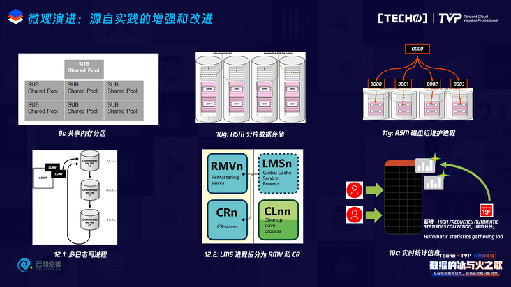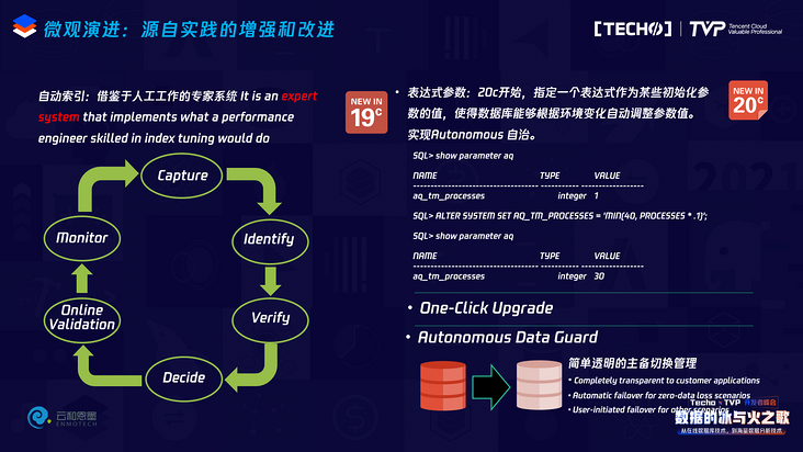 数据库今天着眼于性能向前演进最重要的是什么?是把原来的串行点打散变成并行点,其实就是巨大的性能提升,不管是Oracle还是TDSQL,还是其他国产数据库,今天最主要的创新、性能提升是在做这样的事情。我举几个简单的例子:比如从Oracle9i的时候,开始把共享内存池进行分片拆分,拆成了七份;通过ASM把存储进行分布式地打散;把进程进行主从拆分。比如从12c,把日志写进程变成了主从,在几十年的历程中Oracle的日志写进程只有一个,单进程写日志,但是从12c开始变成了主从,这是一个艰难的改变,我们知道绝大多数数据库的性能瓶颈会产生在日志的同步落盘上,大家都在做优化。19c的实时统计信息,再加上到今天的19c智能化索引——其实这个智能化索引的思路比较简单,它就是把人的思维模拟出来,通过人的专家系统进行思考创建一个什么样的索引,去进行尝试确认,性能提升保留,性能下降则删除——但是真正落到工业实现实属不易。在20c里,提出了自动的参数调节以及自治的主备切换等等,把这些能力都融入数据库中,这是Oracle走过的40多年的技术变革之路,它仍然在这条路上向前奔驰。