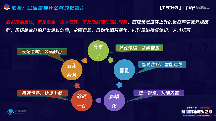 总结一下,刚才是所观察到的行业应用的变化、数据库技术从理论到实践的变化、Oracle的变化包括TDSQL的发展,现在看数据库的演进未来应该是什么样?首先我说数据库的更迭替代一定不是重走一次长征路,不能用国产数据库把商业数据库替换了,但是不好用,这样用户是没办法接受的,所以它一定不应该是功能和体验的降级,而应该是升级,但如何才能升级?我认为这五大方向是我们应该思考的: