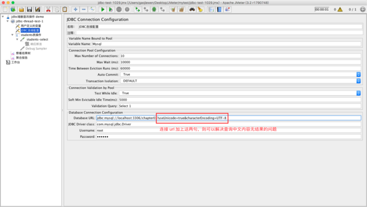 在使用 JMeter 进行 JDBC 查询数据库时,sql 语句使用英文和数字可以查询到记录,而使用中文则查询不到记录,而且使用相同的中文语句,可以在终端命令上和数据库管理工具上也可以查询到。