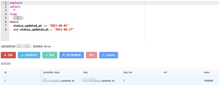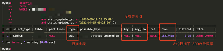 从图上可以看到这条SQL的执行还是走了索引的。走的是根据status_updated_at字段建立的索引。