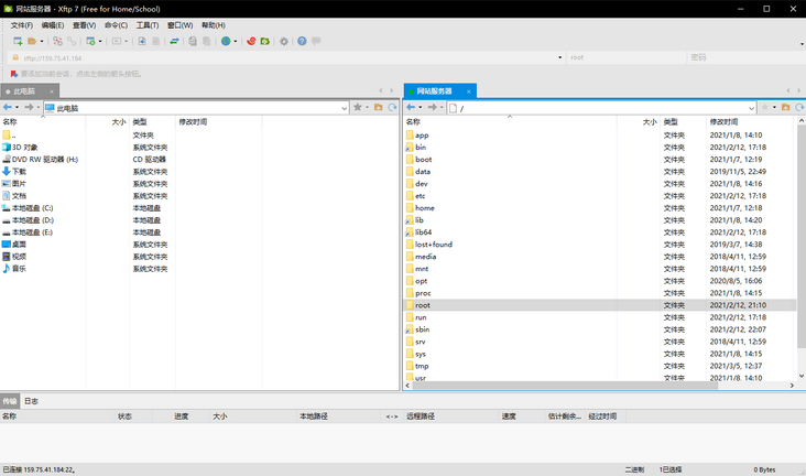 首先在Xftp中新建连接,填写主机地址和用户名密码,连接成功就可以看到左侧选项卡为本地的文件目录,右侧为云服务器的文件目录,只要从左侧或右侧将文件拖动到另一边就可以实现相应文件的上传和下载,下方传输选项卡会显示具体进度,图形化的界面相当直观,不做过多的说明了。