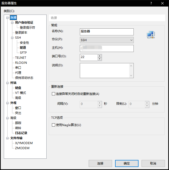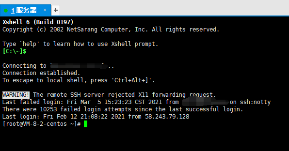Xshell的连接建立方法与Xftp差不多,填写主机地址,连接后再输入用户名密码,连接后就可以在云服务器上进行操作了。