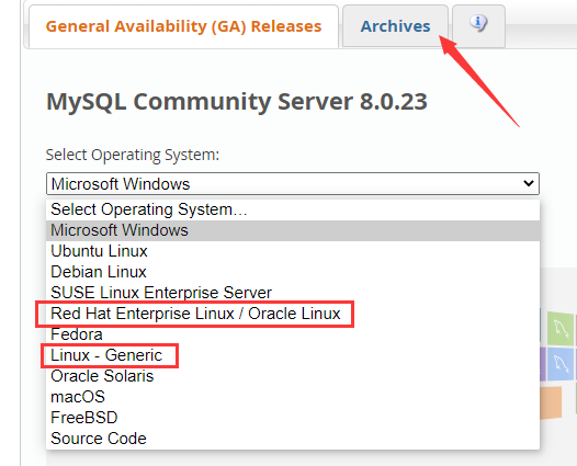 进入网站默认是最新版本,要找之前的版本点击Archives,在新的页面选择对应的版本。然后是选择操作系统,CentOS系统就是Red Hat的社区发行版,内核是相同的,或者用通用版本(Generic)也可以。