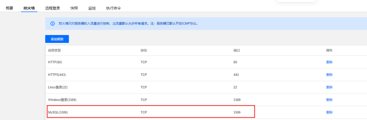 首先要关闭防火墙或者开放数据库的3306端口(最好还是开放端口),