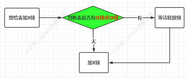 - 如果想给表加X锁,先看下表加没加IS锁或者IX锁,如果有的话,则表明此表中的记录有S锁或者X锁,则需要等到IS锁或者IX锁释放掉后才可以加X锁