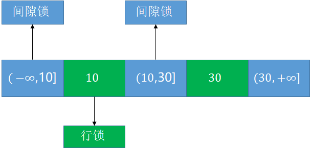 Next-Key Lock加锁,不仅会给f_10=10的行加上行锁,而且还会给这条记录的两边添加上间隙锁,即(-∞,10]、(10,30]这2个区间都加了间隙锁。