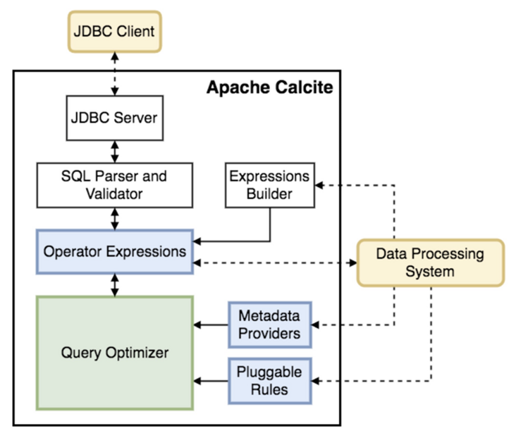 该方案的Apache Calcite极具借鉴意义。Apache Calcite是一个基于SQL的动态数据管理框架,首先它把SQL的语法解析成AST,进行语法校验,接着基于RBO和CBO的查询进行优化,最后通过JDBC等引擎连接外部数据源。此外,Calcite支持元数据对接,开发者可以通过Calcite提供的框架,输入表名、行数、分布、排序等优化所需的元数据信息。